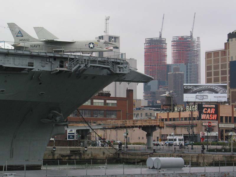 The Navy airplane on the deck of Intrepid Sea-Air-Space Museum and the view of Time Warner Center from Pier 84. 17 November 2002.