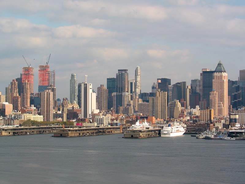Queen Elizabeth 2, the flagship vessel of Cunard, at Pier 90, on the way to Caribbean. Time Warner Center twin towers beyond. 21 December 2002.